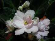 Крупные, полумахровые бело-кремовые c розовинкой цветы. Лист тёмно-зелёный.