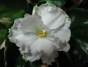 Очень крупные полумахровые волнистые лавандовые цветы с белым центром, широкой белой каймой и мелкими брызгами синего фэнтези. Выставочная розетка из насыщенно-зелёных зубчатых листиков.2010