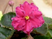 Полу махровые и махровые крупные красно-малиновые цветы с бордовой каймой-фэнтези и тонким белым кантом. Средне-зелёная листва с красной изнанкой, жёлто-оливковая кроновая пестролистность.