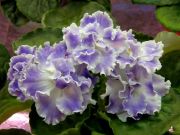 Очень крупные полу махровые и махровые воздушные цветы. По синему фону розовый крупный горох, белая кайма и белый глаз. Стандартная аккуратная розетка.