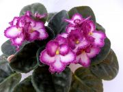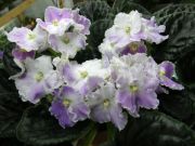 | Обильнейший букет крупных анюток с почти белыми верхними лепестками, горохами белого фэнтази на нижних светло-аметистовых лепестках и гофрированным белым кантом по всему периметру цветка. Темный стеганый лист. Сорт с «изюминкой», очень нежный и очаровательный! |