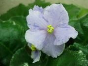 Множество крупных,полумахровых звёзд светло-голубого цвета с синим и розовым фентези в виде штрихов.Края лепестков волнистые светлые.Пестролистник.