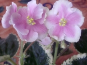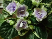 Махровые сиреневые цветы с бело-зеленой каймой. Длительное цветение. Компактная пестролистная розетка