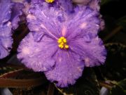 Крупные волнистые дымчато-сиренево-голубые звёзды с двумя видами фэнтези: тёмно-синим и розово-белым. Плюс ко всему тёмно-зелёная пёстрая листва вся в розовых пятнах! Окраска цветов и листьев напоминает весёленький ситец.