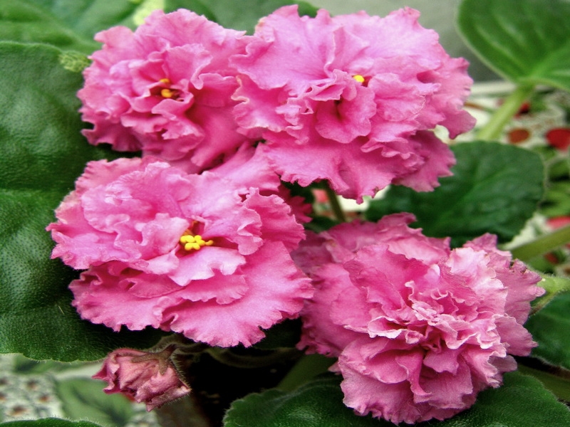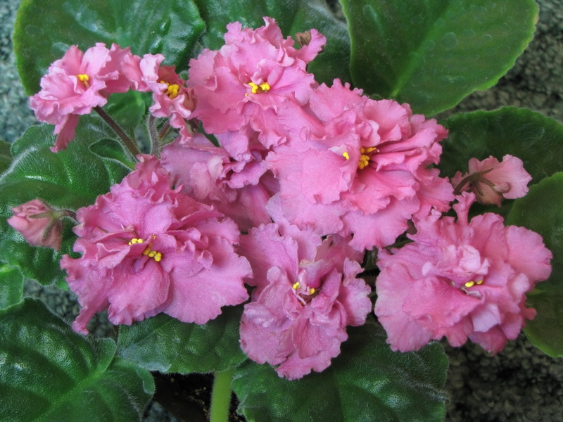Полумахровые и махровые крупные ярко-коралловые цветы с волнистым бахромчатым краем. Темно-зеленые листья, стандартная розетка.