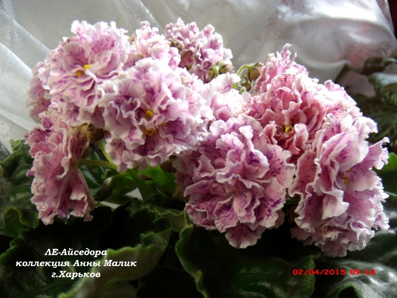 ЛЕ-Айседора (Е.Лебецкая)Крупные простые и полумахровые белые звезды с розовыми напечатками, усыпанные фуксиевыми штрихами фентези. Зеленые ровные листья. 2011
