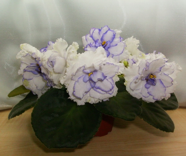 Крупные полностью махровые гофрированные белые цветы с фиолетовым глазком и каймой по каждому лепестку. Стандартная розетка ярко-зеленых листьев.