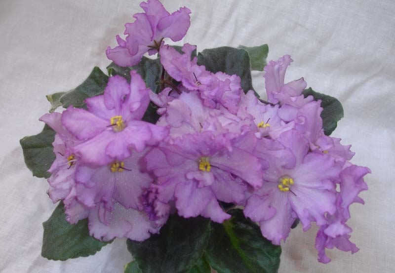 Крупные простые и полумахровые лавандовые звезды с более темной гофрированной каймой. Темно-зеленый "стеганый" лист. Стандарт.