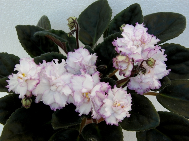 Махровые бахромчатые белые звёзды с лавандово-розовым кантом венчают тёмно-зелёную листву. Цветение обильное