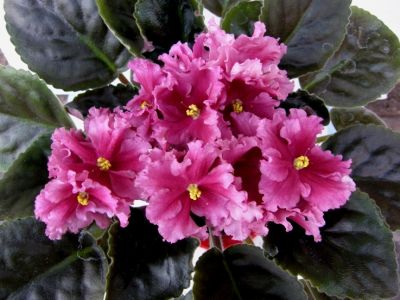 Красивые полумахровые/махровые розово-брусничные звезды с более насыщенным центром и волнистым краем лепестков на аккуратной средне-зеленой ровной розетке.