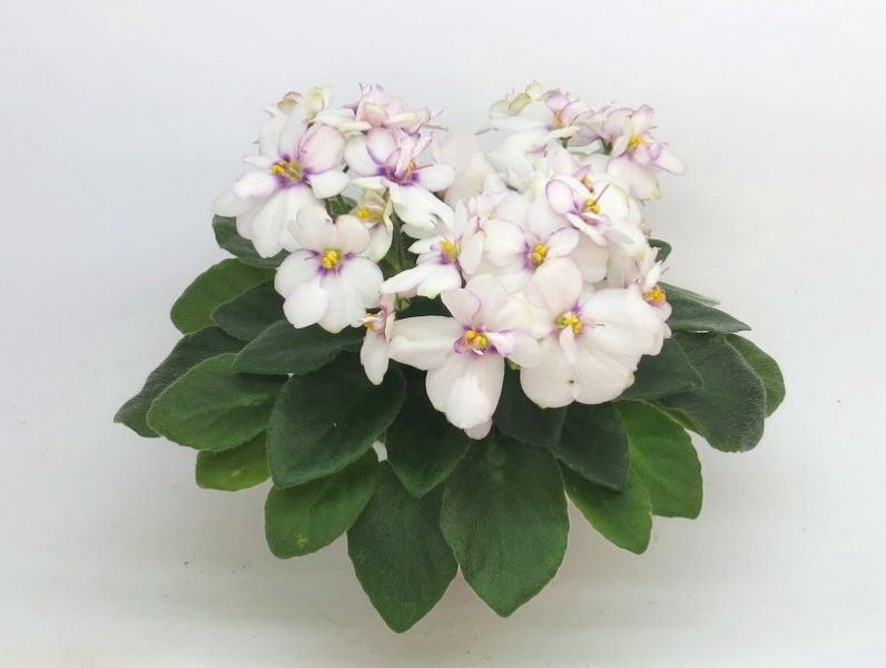 Крупные белые анютины глазки с фуксиевыми краями.Средне-зеленые заостренные листья.Полумини.